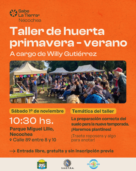 * 10.30 hs. Taller de Huerta, por Willy Gutiérrez. Temática del taller teórico-práctico: la preparación correcta del suelo para la nueva temporada Primavera-verano. ¡Van a hacer plantines en vivo y en directo!