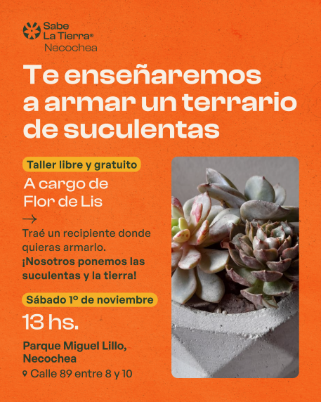 * 13 hs. Taller sobre cómo armar un terrario de suculentas, por Flor de Lis. Llevá un recipiente donde quieras armarlo. Ellos ponen las suculentas y la tierra!